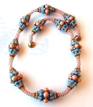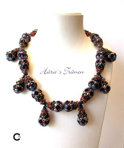 Eine etwas opulente Kette, die dank den verschiedenen Perlensorten sehr interessant zu fädeln ist, obwohl sich der Grundstich stets wiederholt. Ich biete viele Farbvariationen an und denke, dass das Modell sehr anregend für eine eigene Farbgebung ist!