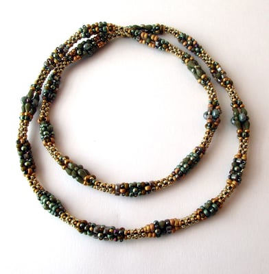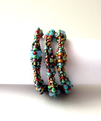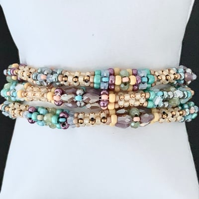 Gefertigt aus Miyuki Rocaillesperlen, Swarovski crystal pearls (Süsswasserperlenimitation) und präzisen Glasschliffrondellen und -würfeln.
